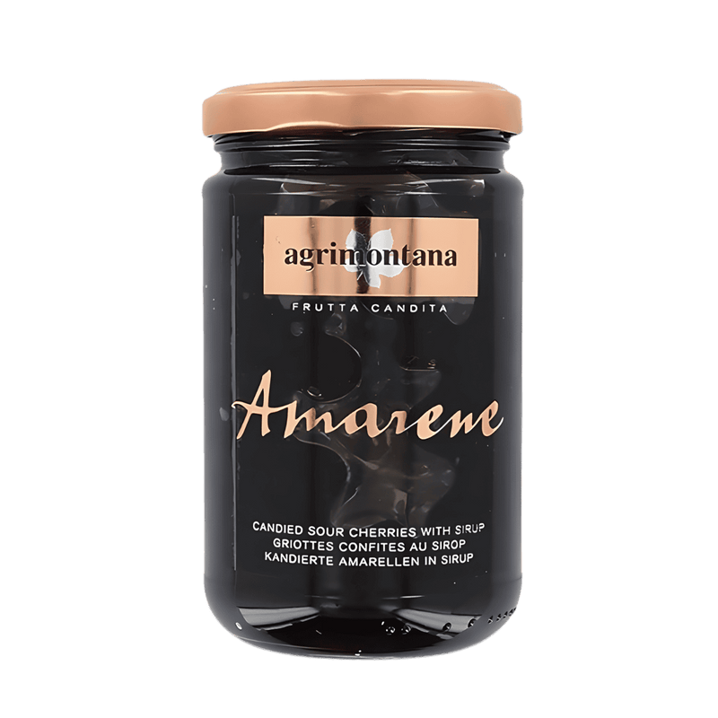 Meet the pastry-chef classic for sundaes, cakes, and cocktails: Agrimontana Amarena (candied sour cherries) in syrup. Each cherry is pitted, hand-calibrated, and candied to preserve its deep color and bright aroma—ready to spoon over gelato, fold into desserts, or garnish drinks.