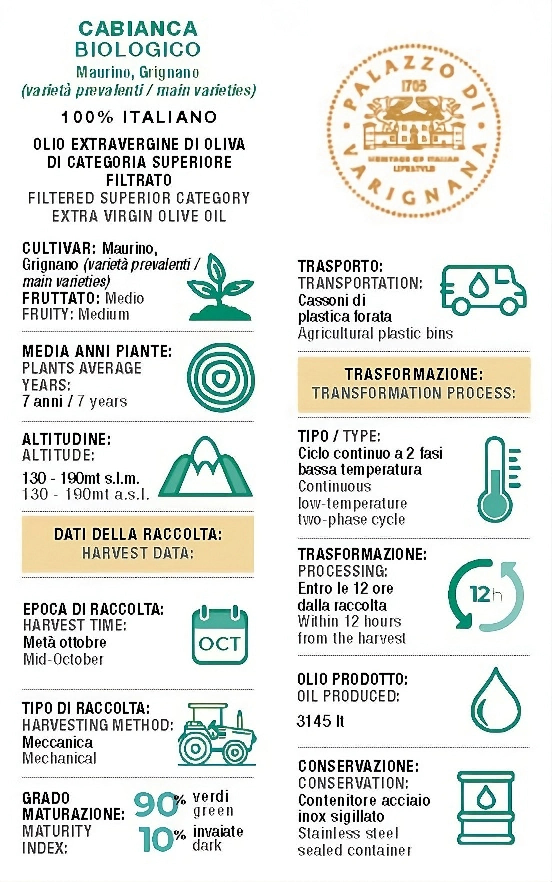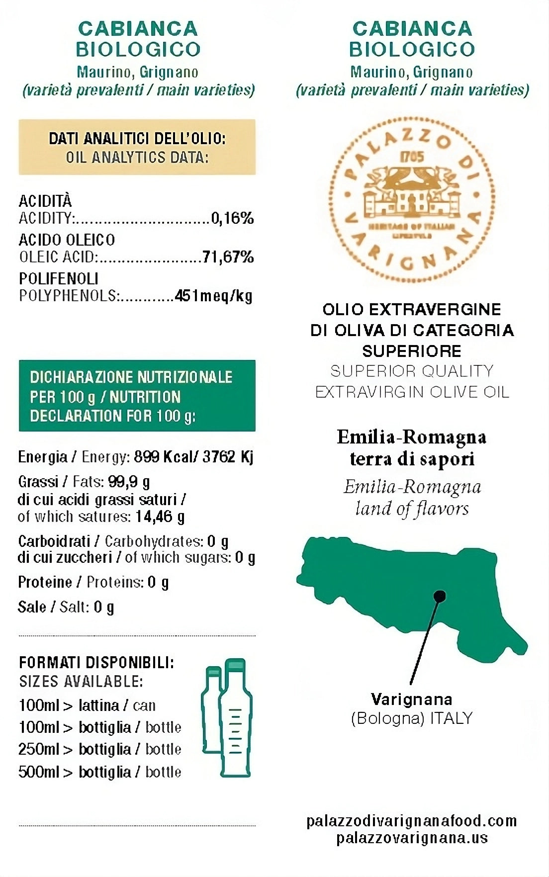 Produced by Palazzo di Varignana from select olives grown in Emilia-Romagna’s rolling hills, Cabianca Bio offers a sophisticated flavor and smooth texture. This high-polyphenol content oil reflects authentic Italian quality and sustainable craftsmanship. Ideal pairings include bruschetta, pinzimonio, legume soups, and caprese salad. This olive oil is also phenomenal drizzled on pizza and focaccia.