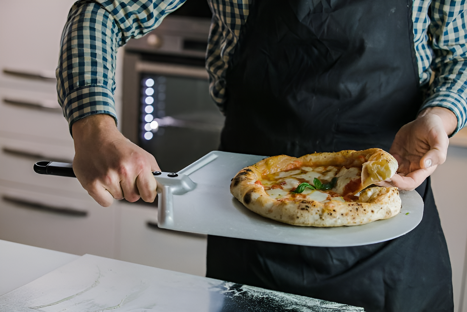 This Classica Pizza peel is made of lightweight, easy-to-clean anodized aluminum with a short 9.8" handle, perfect for home ovens. Its durable construction supports pizzas up to 12" and fits traditional electric, gas, and wood ovens, making it a practical tool for any home pizza maker.