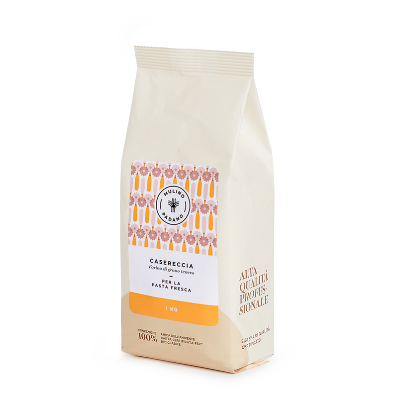 Mulino Padano Type 00 Casereccia is a dedicated fresh-pasta flour with a controlled grain size and very low ash content of under 0.40%. These characteristics produce a dough that is elastic yet easy to roll, with an intense golden colour that stays bright over time and resists greying and overcooking. Designed for both hand-made and extruded pasta, it’s ideal for egg pasta formats like tagliatelle, tortellini, ravioli and gnocchi.